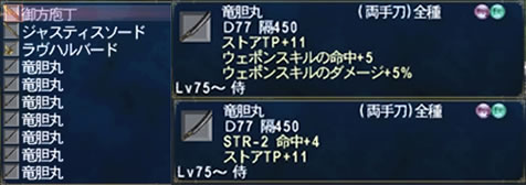 理想のオーグメントはストアTP+15 WSダメージ+7%辺りでしょうか。