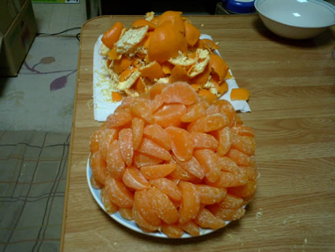 みかんの皮を1個1個剥き、白いスジもできるだけ取り除いて。