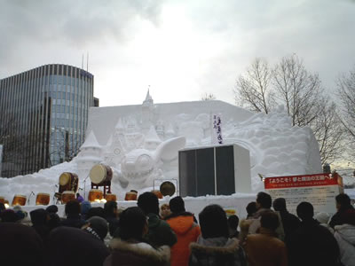 雪で作られたステージの上で、和太鼓の演奏やってました。